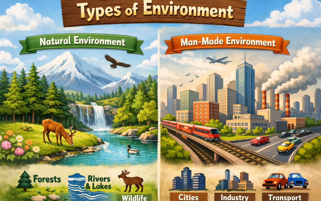2. ಮಾನವ ನಿರ್ಮಿತ ಪರಿಸರ ಎಂಬ ಎರಡು ಪ್ರಕಾರಗಳಲ್ಲಿ ವಿಂಗಡಿಸಲಾಗಿದೆ.