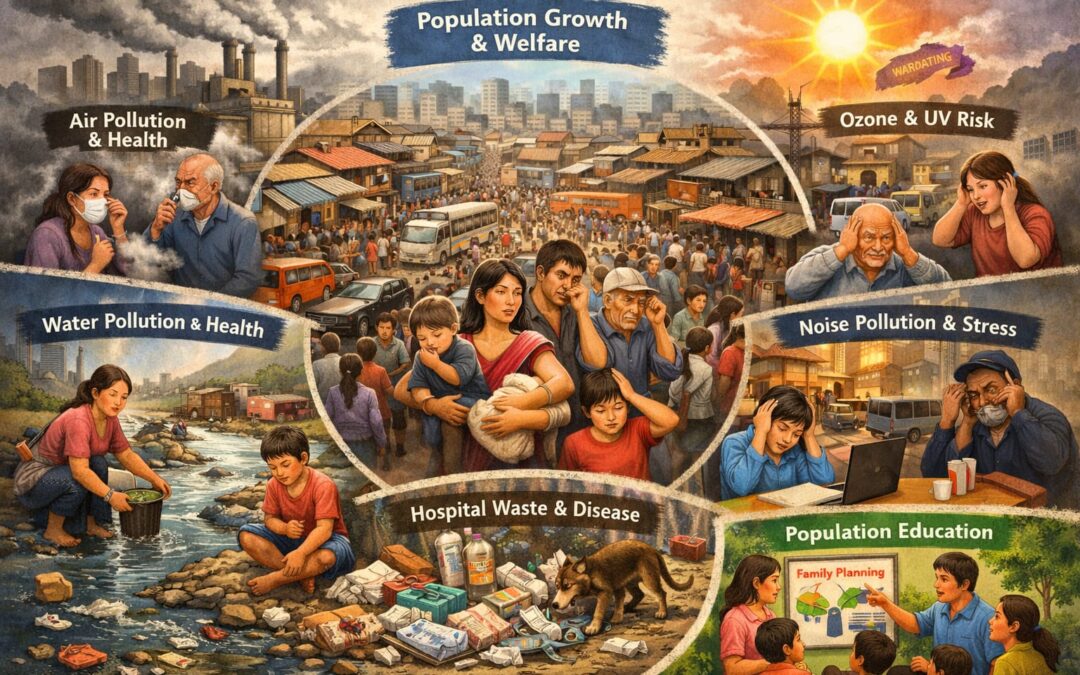 1. ವಾಯು ಮಾಲಿನ್ಯ ಮತ್ತು ಆರೋಗ್ಯ: ಭಾರತದಲ್ಲಿ ಹೆಚ್ಚುತ್ತಿರುವ ಕೈಗಾರಿಕೆಗಳು, ನಗರೀಕರಣ, ಅತಿಯಾದ ವಾಹನಗಳ ದಟ್ಟಣೆ, ಗಣಿಗಾರಿಕೆ, ಮೊದಲಾದವುಗಳಿಂದ ಹೊರಬರುವ ಗಂಧಕದ ಆಕ್ಸೈಡ್, ನೈಟ್ರೋಜನ್ ಡೈ ಆಕ್ಸೈಡ್‌ನಂತಹ ಮಾಲಿನ್ಯಕಾರಕಗಳು ಶಾಖೋತ್ಪನ್ನ ಘಟಕಗಳಿಂದ ಹೊರಬರುವ ಧೂಳು ಅಥವಾ ಬೂದಿಯ ಕಣಗಳು ಇತ್ಯಾದಿ ಮಾನವನಿಗೆ ಹಲವಾರು ರೋಗಗಳು ಬರುವಂತೆ ಮಾಡುತ್ತವೆ. ವಾಯುಮಾಲಿನ್ಯ ಸಾಮಾನ್ಯವಾಗಿ ನಗರ ಹಾಗೂ ಕೈಗಾರಿಕಾ ಪ್ರದೇಶಗಳಲ್ಲಿ ಕಂಡುಬರುತ್ತದೆ. ಹೀಗಾಗಿ ನಗರವಾಸಿಗಳು ಶ್ವಾಸಕೋಶಿ ಸಂಬಂಧಿ ಕಾಯಿಲೆಗಳು, ಅಸ್ತಮಾ, ಅಲರ್ಜಿ, ಕೆಮ್ಮು, ನೆಗಡಿ, ಕ್ಷಯ, ಶ್ವಾಸಕೋಶದ ಕ್ಯಾನ್ಸರ್, ನ್ಯೂಮೋನಿಯಾ ಗಂಟಲು ಬೇನೆ, ಚರ್ಮರೋಗ ರಕ್ತಸ್ರಾವ ಮುಂತಾದ ಕಾಯಿಲೆಗಳಿಗೆ ತುತ್ತಾಗುತ್ತಾರೆ. ಬೆಂಗಳೂರು ನಗರದಲ್ಲಿ ಕೈಗೊಂಡ ಅಧ್ಯಯನದಿಂದ ವಾಹನ ದಟ್ಟಣೆ ಅಧಿಕವಾದ ಕಾರಣ ಅಲ್ಲಿನ ಶಾಲಾ ಮಕ್ಕಳಲ್ಲಿ ಅಸ್ತಮಾ ಹಾಗೂ ಉಸಿರಾಟದ ಸಮಸ್ಯೆಗಳ ಪ್ರಕರಣಗಳು ಬೇರೆ ಪ್ರದೇಶದ ಮಕ್ಕಳಿಗಿಂತಲೂ ಹೆಚ್ಚು ಕಂಡು ಬಂದಿವೆ. ರಸ್ತೆಯಲ್ಲಿ ಕರ್ತವ್ಯ ನಿರ್ವಹಿಸುತ್ತಿರುವ ಟ್ರಾಫಿಕ್ ಪೊಲೀಸರು ಉಸಿರಾಟದ ತೊಂದರೆಯಿಂದ ಬಳಲುತ್ತಾರೆ. ಕಾರ್ಬನ್ ಮೊನಾಕ್ಸೈಡ್, ಸೀಸಗಳಂತಹ ವಿಷಕಾರಿ ವಸ್ತುಗಳು ದೇಹವನ್ನು ಸೇರಿದಾಗ ದೇಹದ ಕೆಲವು ಭಾಗಗಳು ಹಾನಿಗೊಳಗಾಗುತ್ತದೆ.  ಬೆಂಜಿನ್ ಎನ್ನುವ ರಸಾಯನಿಕ ಕ್ಯಾನ್ಸರ್ ಕಾಯಿಲೆಗೆ ಕಾರಣವಾಗುತ್ತದೆ.