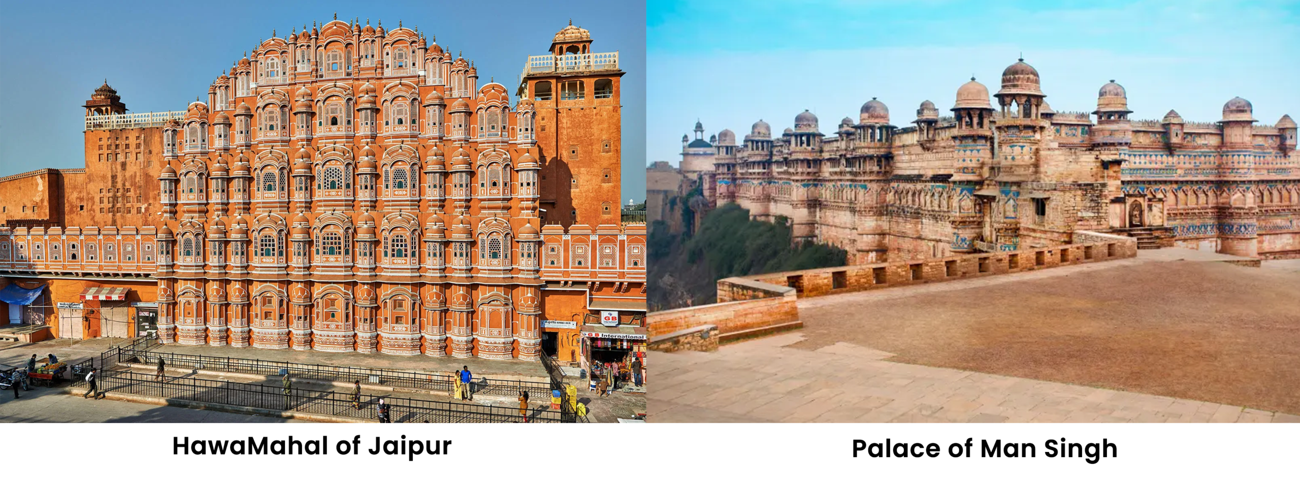 ಮಾನ್‌ಸಿಂಗ್ ಅರಮನೆ ನಾಲ್ಕು ಮಹಡಿಗಳನ್ನೊಳಗೊಂಡಿದ್ದು, ಕೆಂಪು ಮತ್ತು ಹಳದಿ ಮರಳುಗಲ್ಲಿನಿಂದ ನಿರ್ಮಾಣವಾಗಿದೆ. ಅರಮನೆಯ ಗೋಡೆಗಳ ಮೇಲೆ ಸುಂದರ ಚಿತ್ರಕಲೆಗಳು, ಹೂವಿನ ಅಲಂಕಾರಗಳು ಮತ್ತು ಭೌಮಿತೀಯ ವಿನ್ಯಾಸಗಳು ಕಾಣಸಿಗುತ್ತವೆ. ಒಳಾಂಗಣದಲ್ಲಿರುವ ಸಭಾಂಗಣಗಳು, ಮಂಟಪಗಳು ಮತ್ತು ದರ್ಬಾರ್ ಹಾಲ್‌ಗಳು ಅದರ ವೈಭವವನ್ನು ತೋರಿಸುತ್ತವೆ.